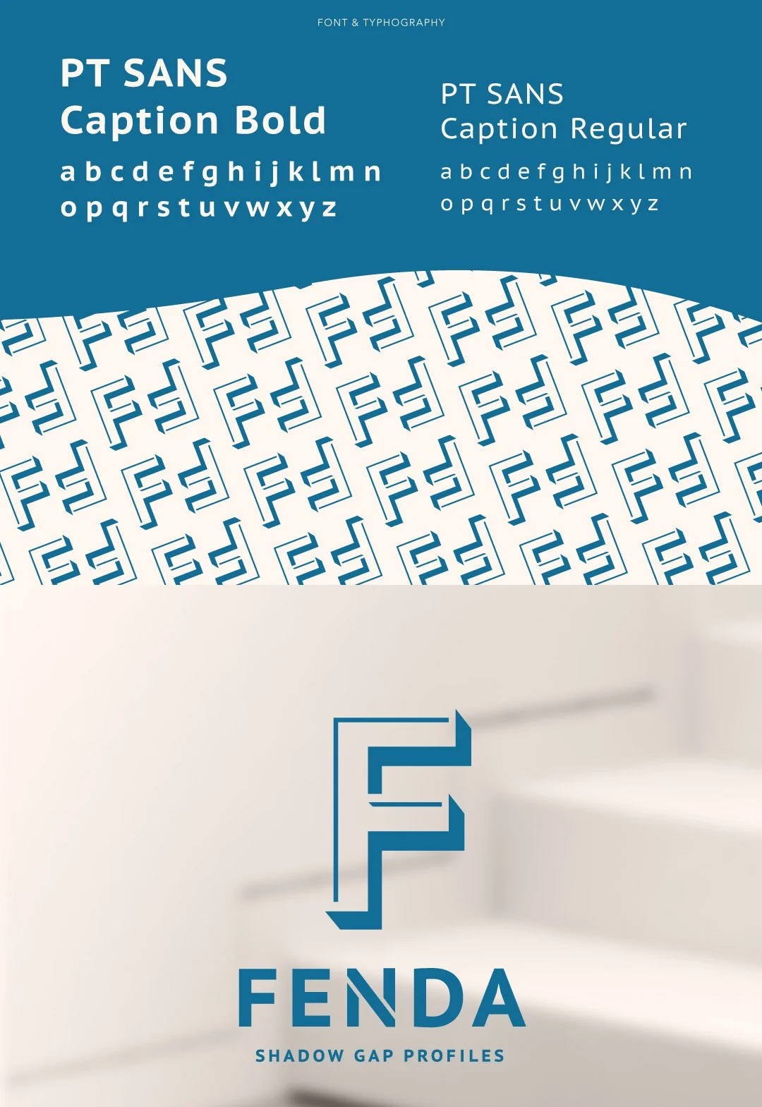Besides breaking the big “no-no” of logo design and including a feather faded gradient in its logo mark, most importantly, Fenda’s old logo does not showcase the type of shadow that the company’s shadow gap profiles create. The shadows these gap profiles drop look more like straight, crisp lines than feathered-out long shadows. I wanted the logo to reflect what the company offers more accurately in my new design.