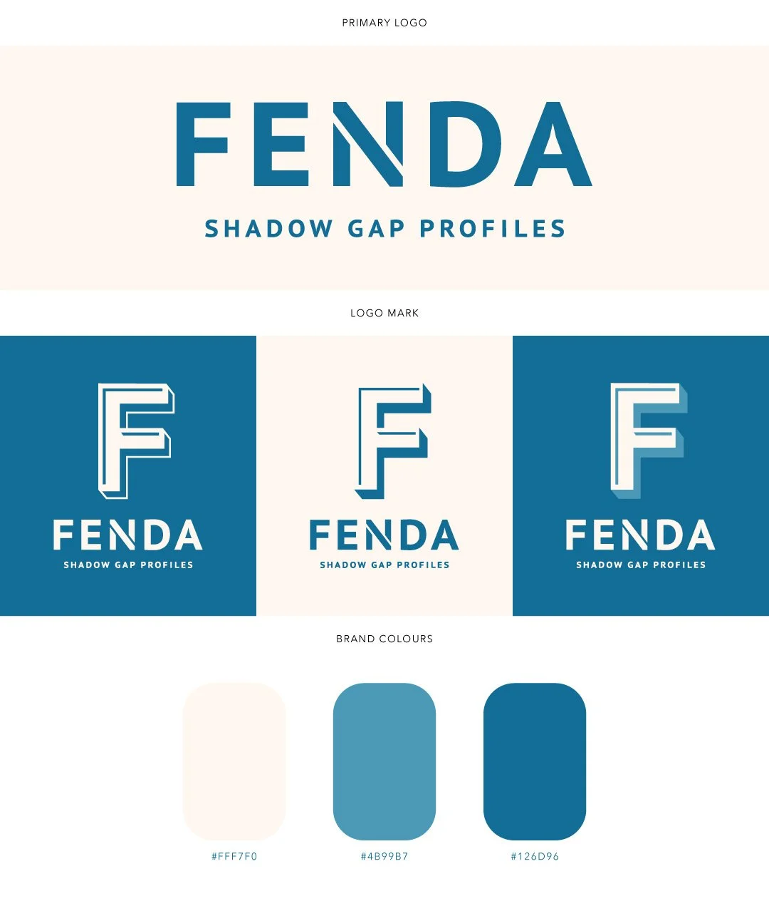 I settled on a minimalistic style and crisp, clean, angular lines for the new logo mark. For the brand colours, I chose a calm, blue hue, reminiscent of the colour of shadows in the summer, as well as a warm cream colour that elevates the overall look and evokes sophistication – the way that Fenda’s gap profiles do.