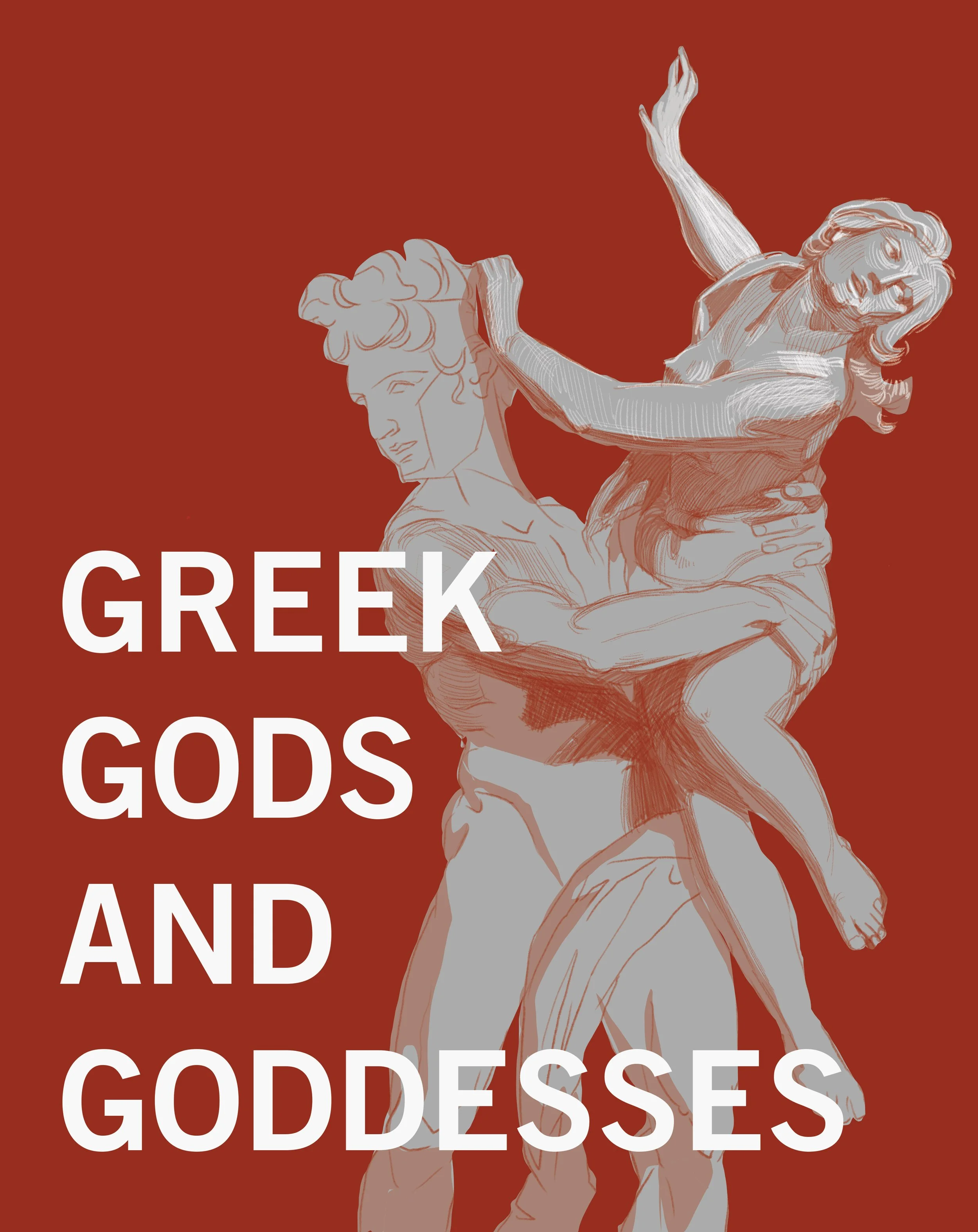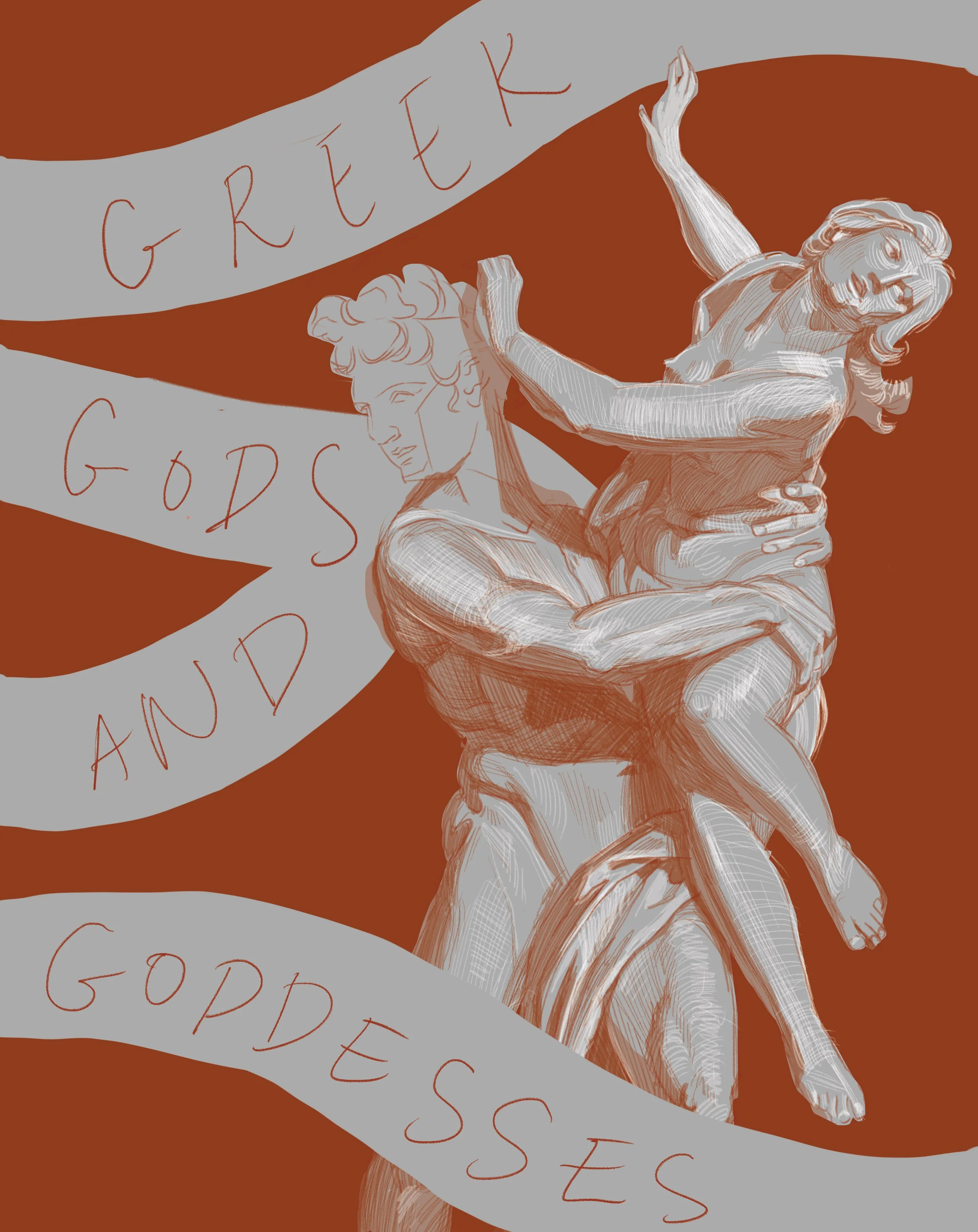 The current cover of this publication is beautiful, but in my opinion, it is lacking the dramatic expression, emotion and movement that ancient myths are so full of. This sculpture had all of these qualities, and so it became the main source of inspiration for my cover illustration.