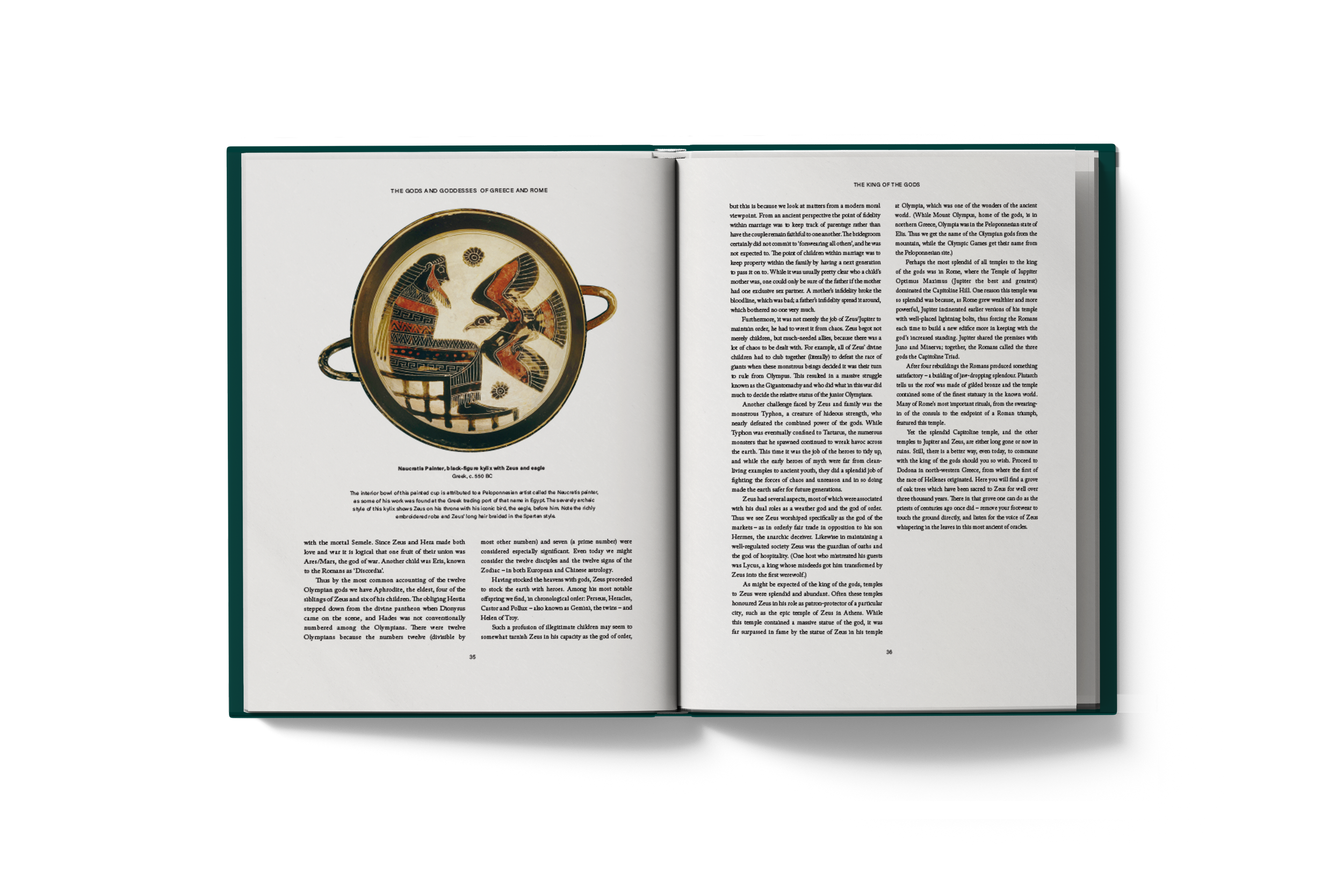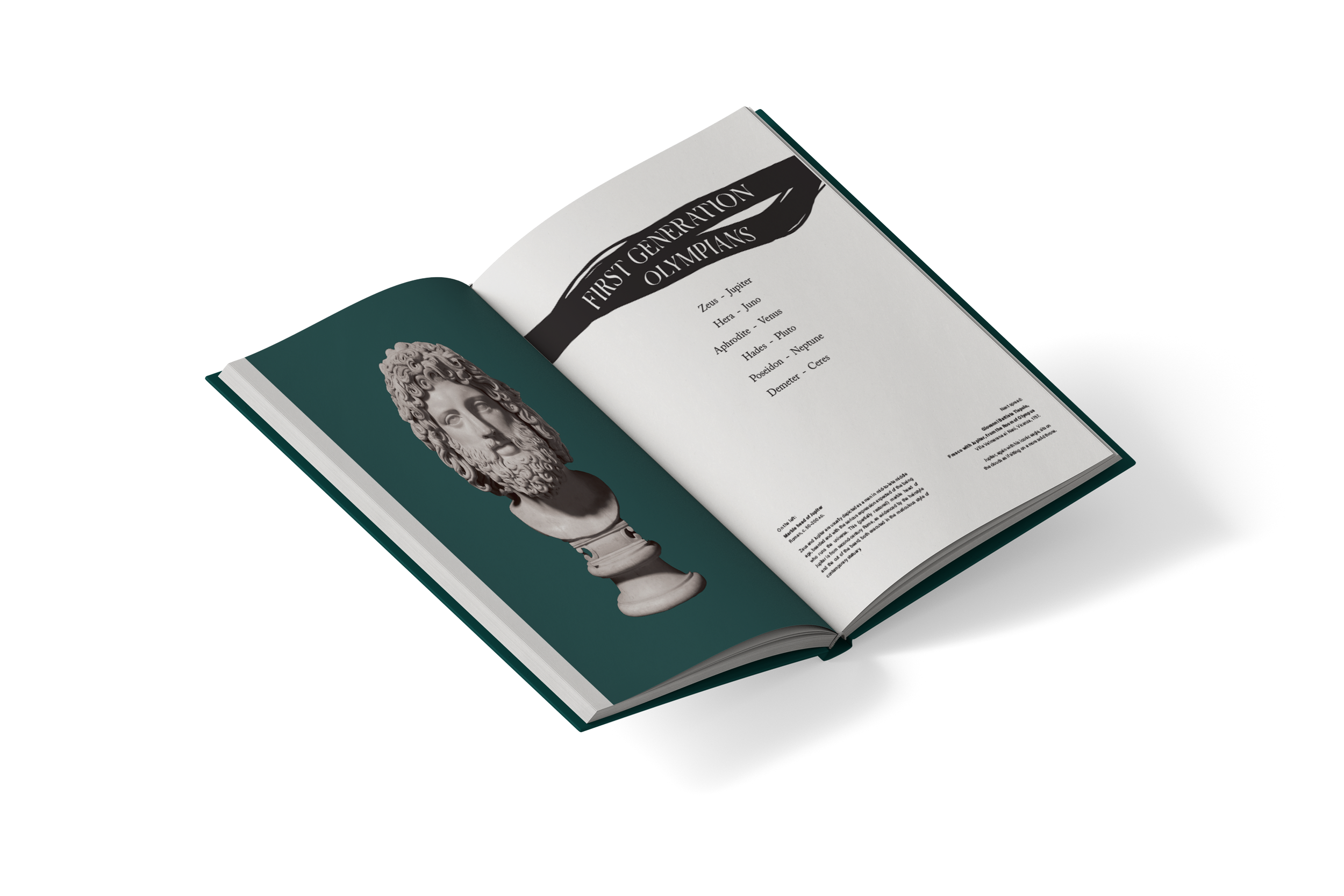 For the endpapers, I depicted the names of gods and goddesses on the same ribbon-like elements I included on the cover. The names of Greek gods are placed on the front endpapers, and their respective Roman counterparts - on the back. These ribbons appear throughout the layout design, marking chapter titles as well and tying the design together. The teal colour of the cover is present throughout the book as well.