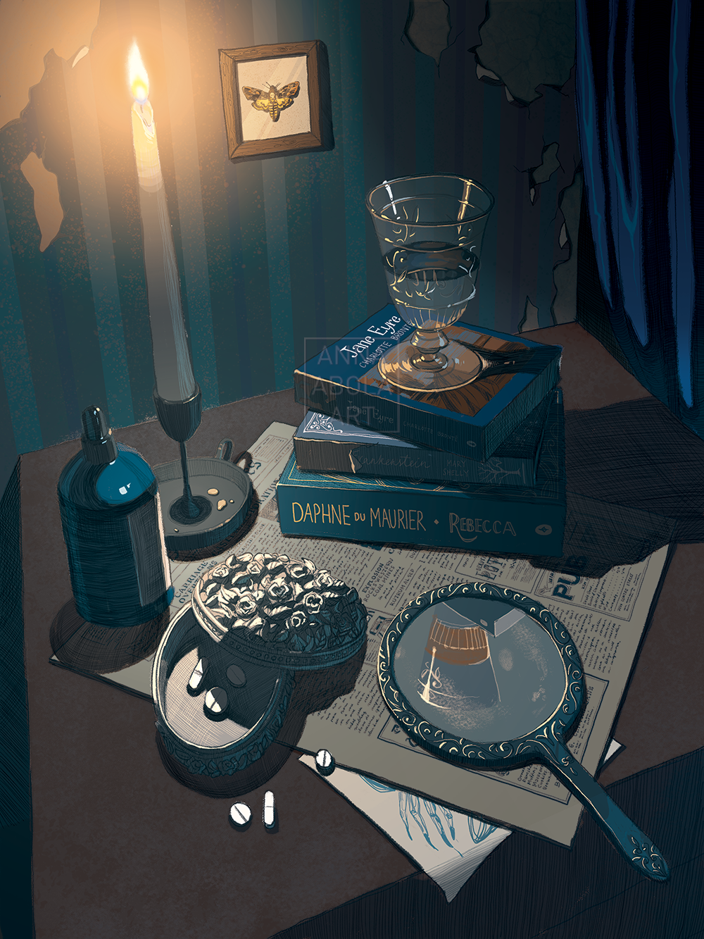 She poured herself some tea, lit a candle that filled the room with the smell of lavender and placed a mirror in front of her. She remembered how terrifying it was to look in the mirror once she woke after her nightmares as a kid. For a while she kept all of them covered. But after discovering the deep slumber her grandmother’s pills would induce, she slowly started getting used to her reflection again. It had taken a long time to make that heart-sinking feeling disappear as she beheld her own gaze. She felt like the spell was about to crack any minute now, like it would all shift again if she looked into the glass for too long. But it didn’t. It wouldn’t, she told herself.