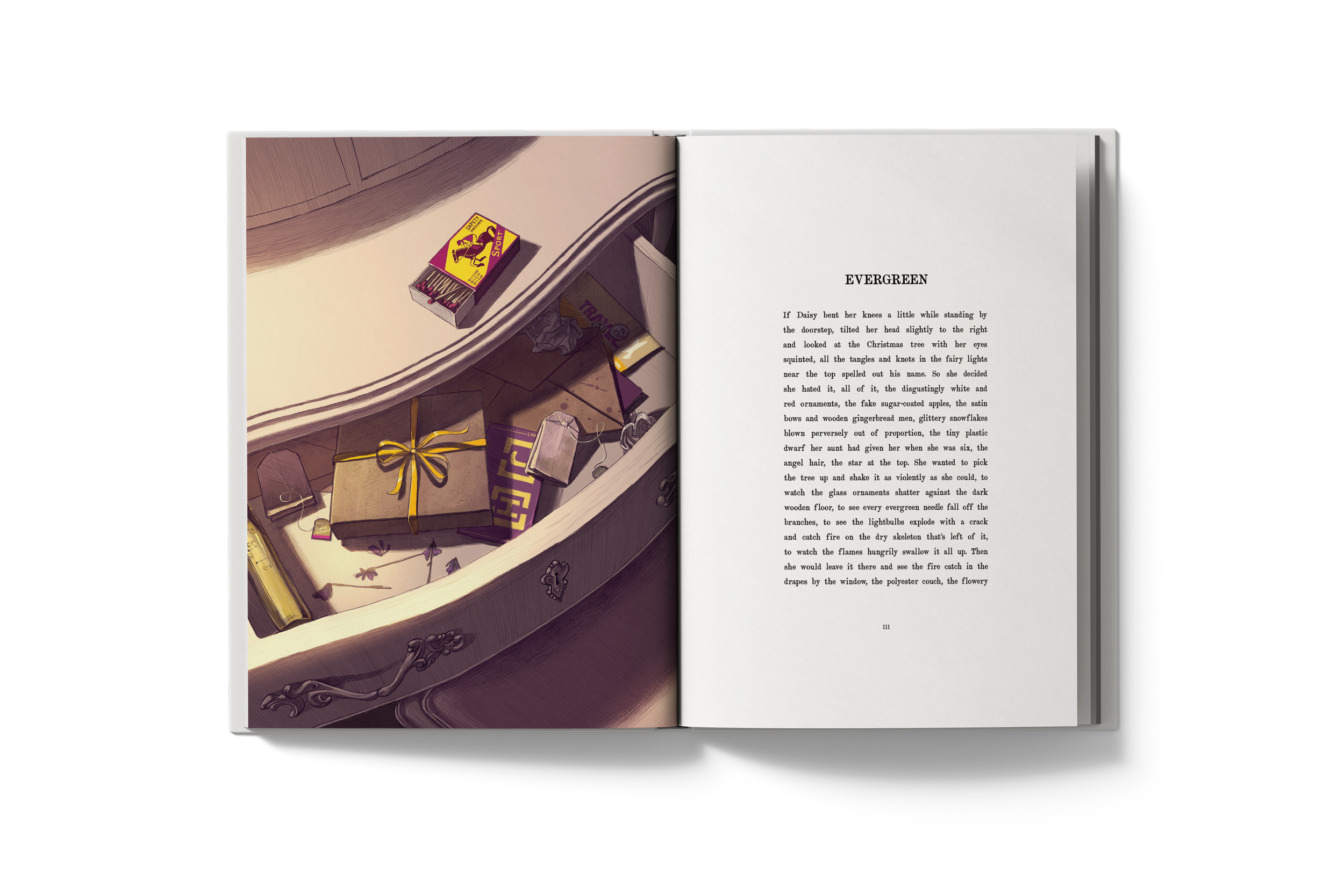 The illustration is printed on the left side of the spread, opposite the first page of each story. It’s traditionally seen in Victorian novels as well. But I also wanted the reader to see the illustration first, before they even read the words I’ve written – therefore giving them the chance to imagine what the story could be about for themselves first.
