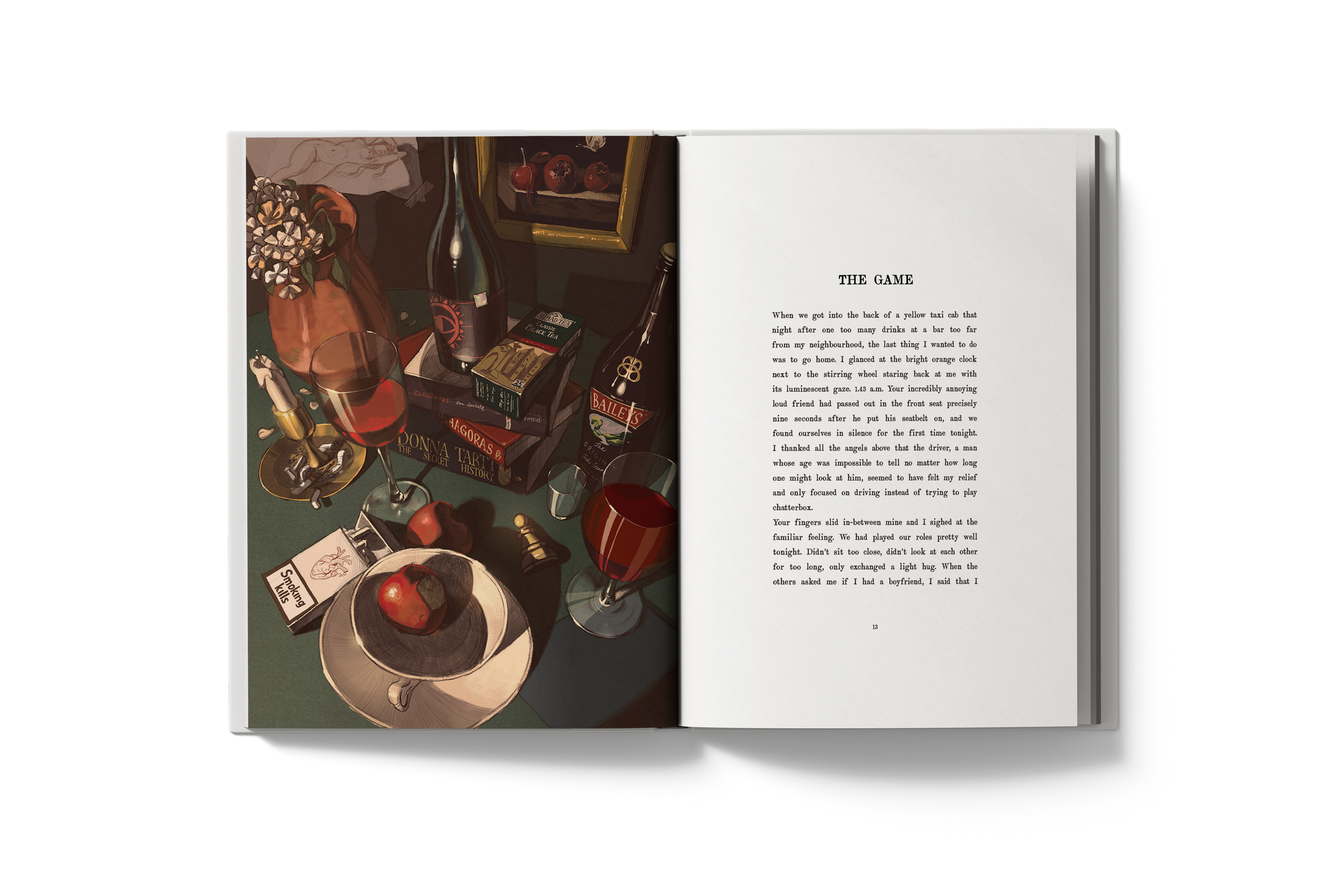 My goal for the layout and design of “Heartbreak Anatomy“ was to combine the aesthetic qualities of nineteenth-century novels that have inspired me both as a visual artist and as a writer with the contemporary world of digital illustration and UV print. Each element in this book was chosen with the intent of symbolically tying the stories together and connecting them into a greater message to the reader.