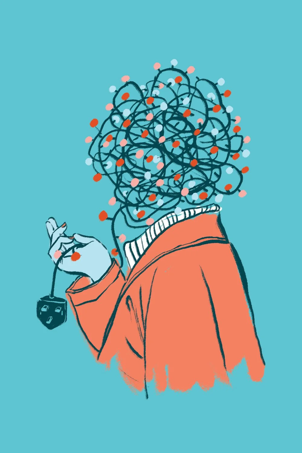 The birth of my idea for a holiday design for Hopfully began with exploring what the winter holidays mean to me. I landed on my personal attachment to Christmas lights and the holiday cheer they can instantly bring anywhere. It’s the first thing I put up in my home in December to get a feeling of warmth and hope during the darker winter months. However, as we all know, holidays are not only the time for relaxation and presents; it’s also quite a stressful and chaotic period where we all worry about having enough time for shopping, cooking, and presents, and now, during the strange pandemic times, we often worry if we will be able to spend the season with our loved ones at all. I wanted to portray this feeling of chaos by making the Christmas lights tangled and in the place where my character’s head would be – to visualise the feeling of chaos and uncertainty as well as cheer, brightness and hope in all of our minds during this time.