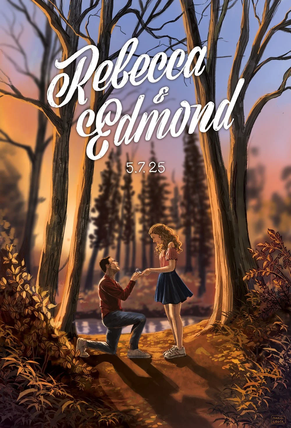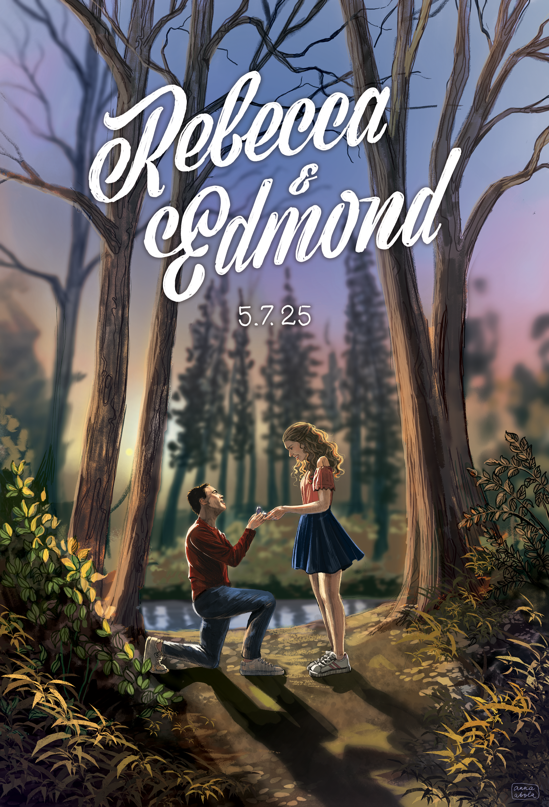 My dear friends Edmond and Becca got married recently, and I had the absolute joy and honour of creating a wedding welcome sign for them. They wanted the illustration to depict the moment of their proposal.