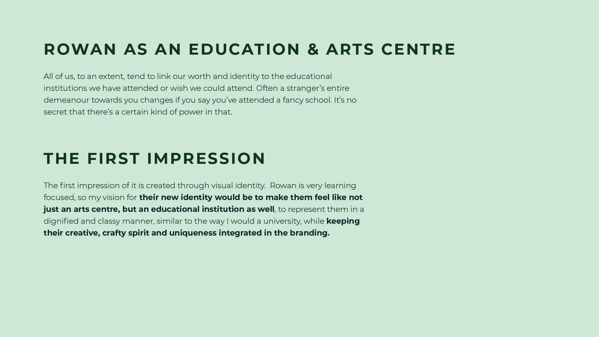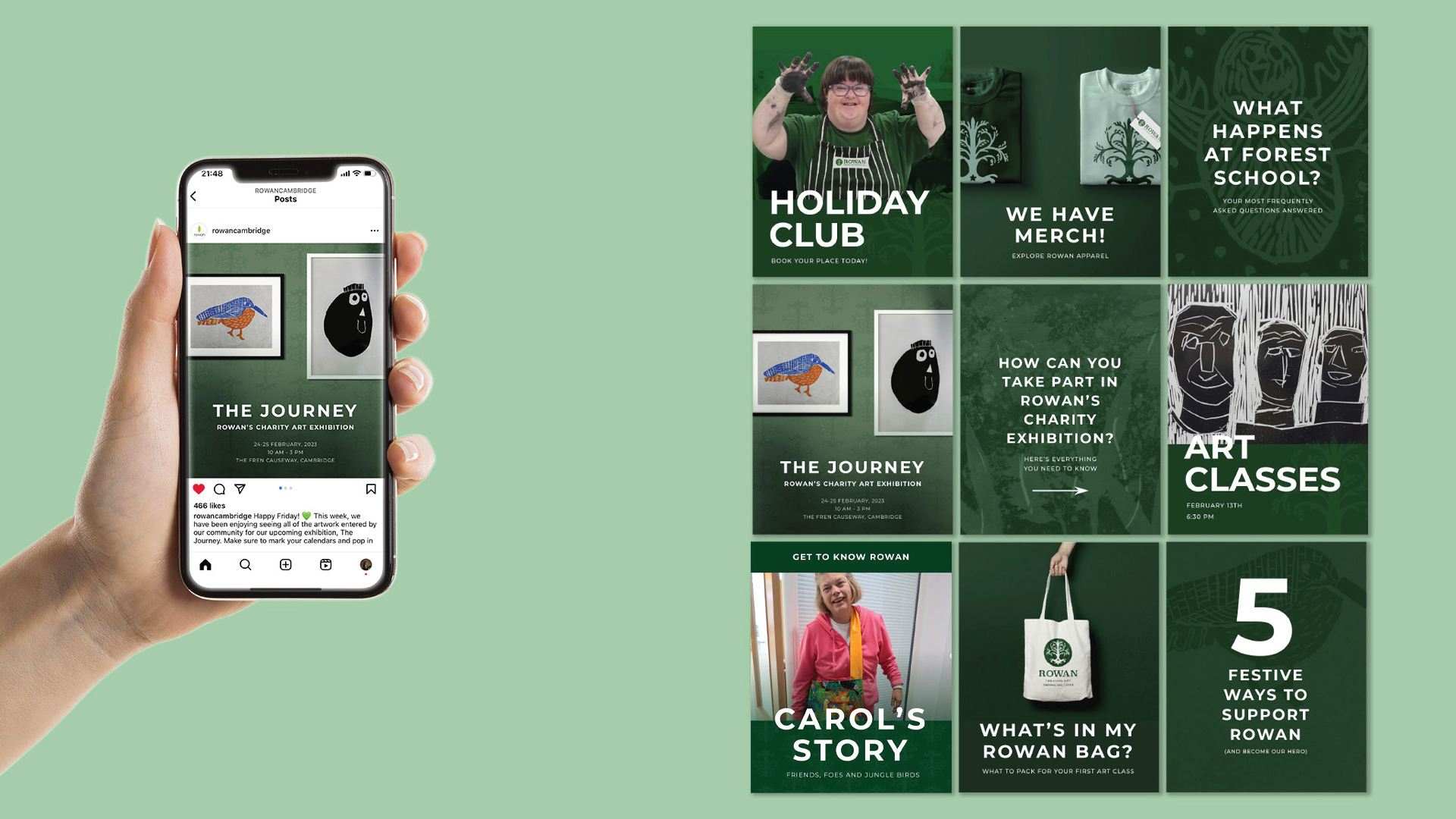 Rowan is a Cambridge based arts centre and forest school for adults with learning disabilities. They focus on provinding their community with creative learning workshops in printmaking, woodcarving, textile, ceramics, music and mixed media. The arts centre wanted to update their outdated graphic identity and the visuals you can see here and on the next few pages convey how I envisioned the arts centre looking like after a rebrand.