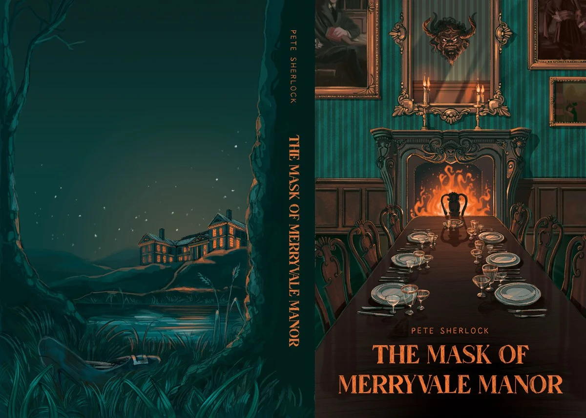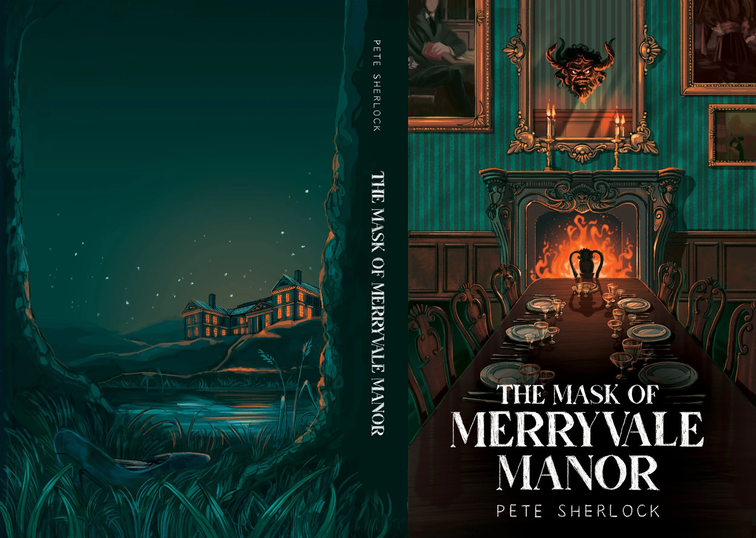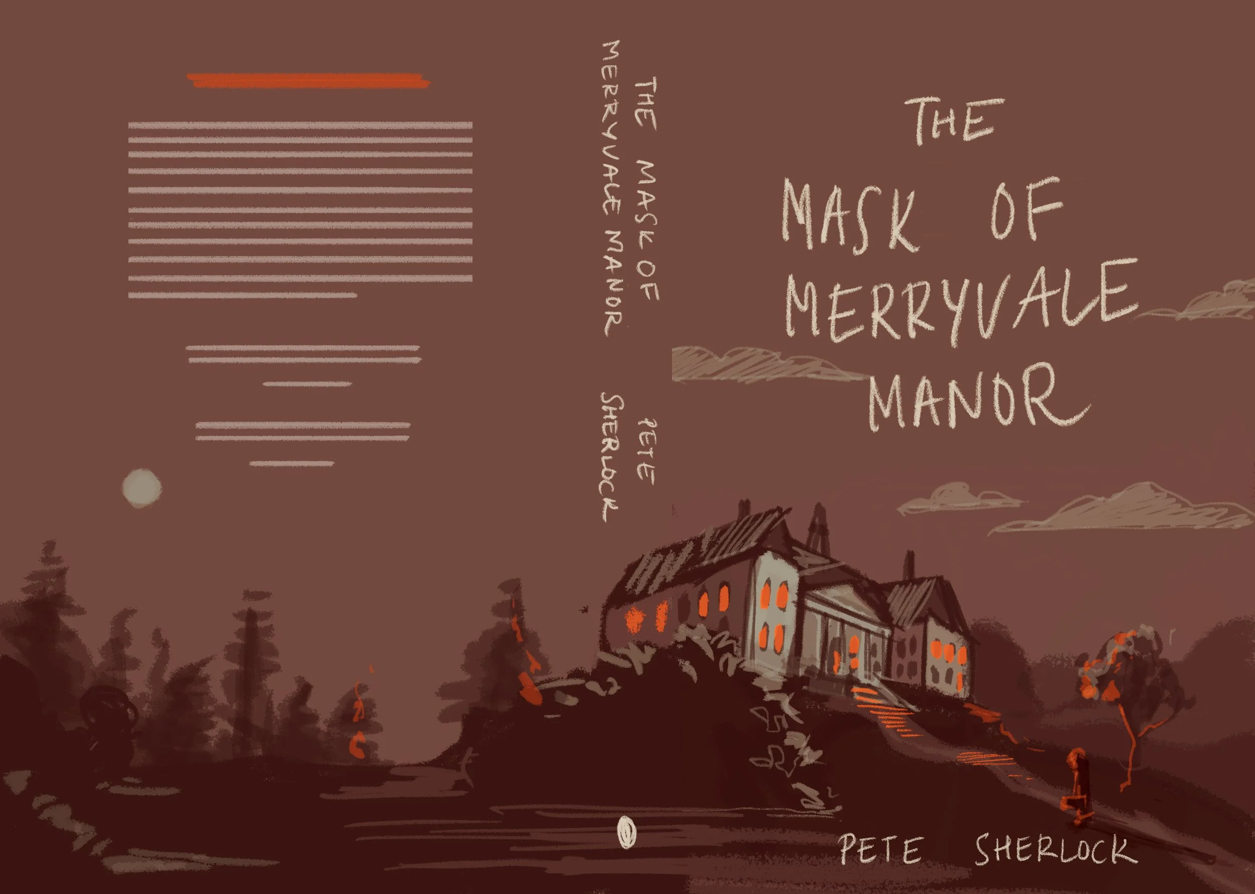 In 2024 I was approached by Fairlight Books to create a full jacket for their upcoming paperback – ‘The Mask of Merryvale Manor’ by Pete Sherlock – that was released on June 20th, 2024. I am a fan of murder mystery novels, so this was a delightful opportunity.